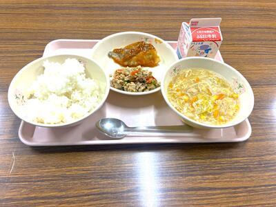 今日の給食はガパオライス&白身魚のチリソース&ヌードルスープ&牛乳です(写真1参照)