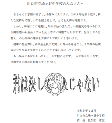 す。学校への相談が難しい場合は、川口市教育委員会または埼玉県教育委員会の相談窓口にご連絡ください。