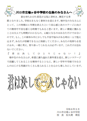 長期休業明けは子どもたちの心が整い辛い時期でもあります。規則正しい生活を心がけ、休み中に悩み事や相談事があれば学校へ連絡・相談していただき、不安を少しでも解消して二学期を迎えられればと思います。ご家庭での生活時間が長くなる時期だからこそ、些細な変化を見逃さず、学校と家庭が一緒になって子どもたちを見守っていきましょう。